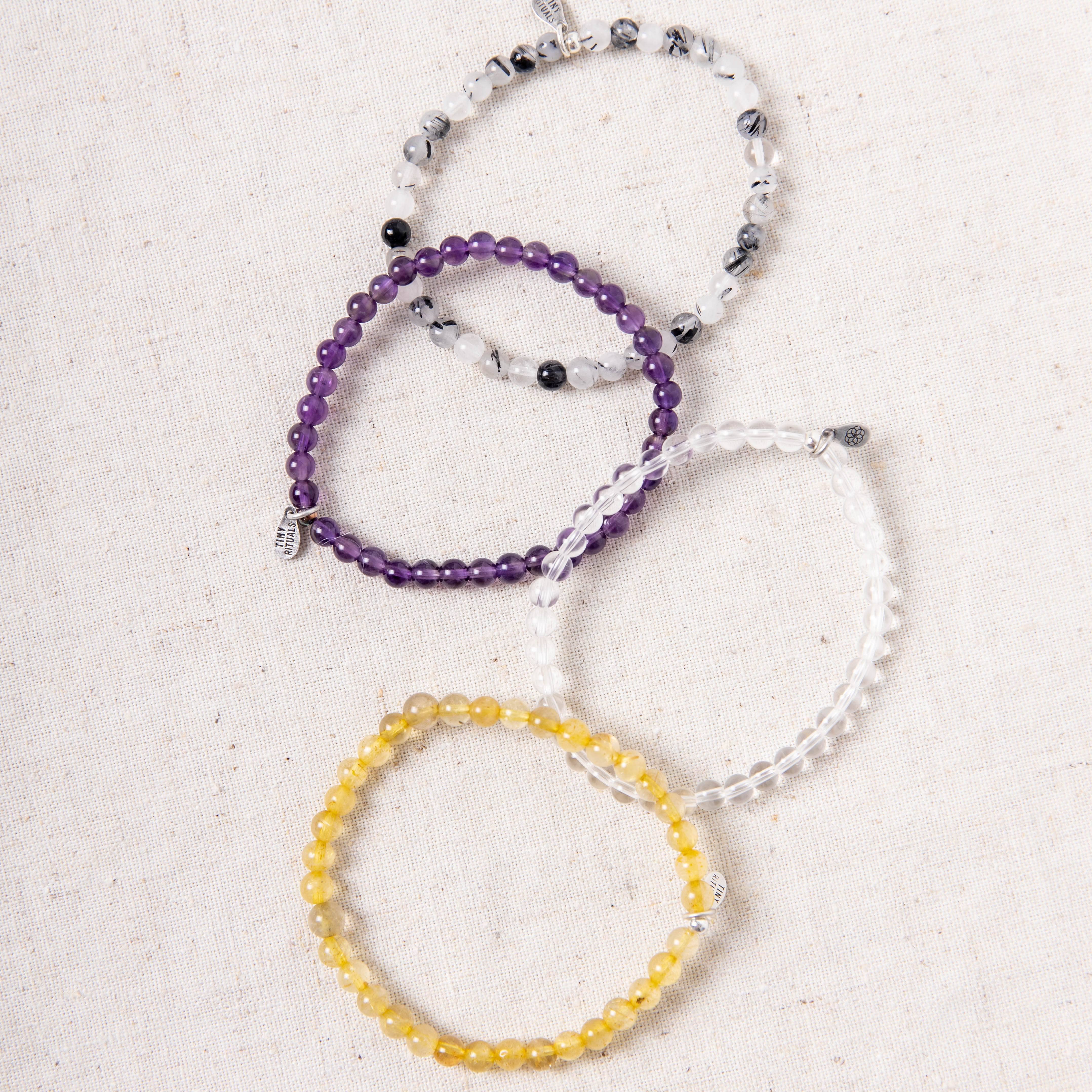 Hit a high note on your healing journey as you say yes to the cycle of absorb, store, release and regulate to bring you back to balance. The Master Healing Bracelet Set marries the soothing stones of Amethyst, Clear Quartz, and Yellow and Black Rutilated Quartz to lighten your load.