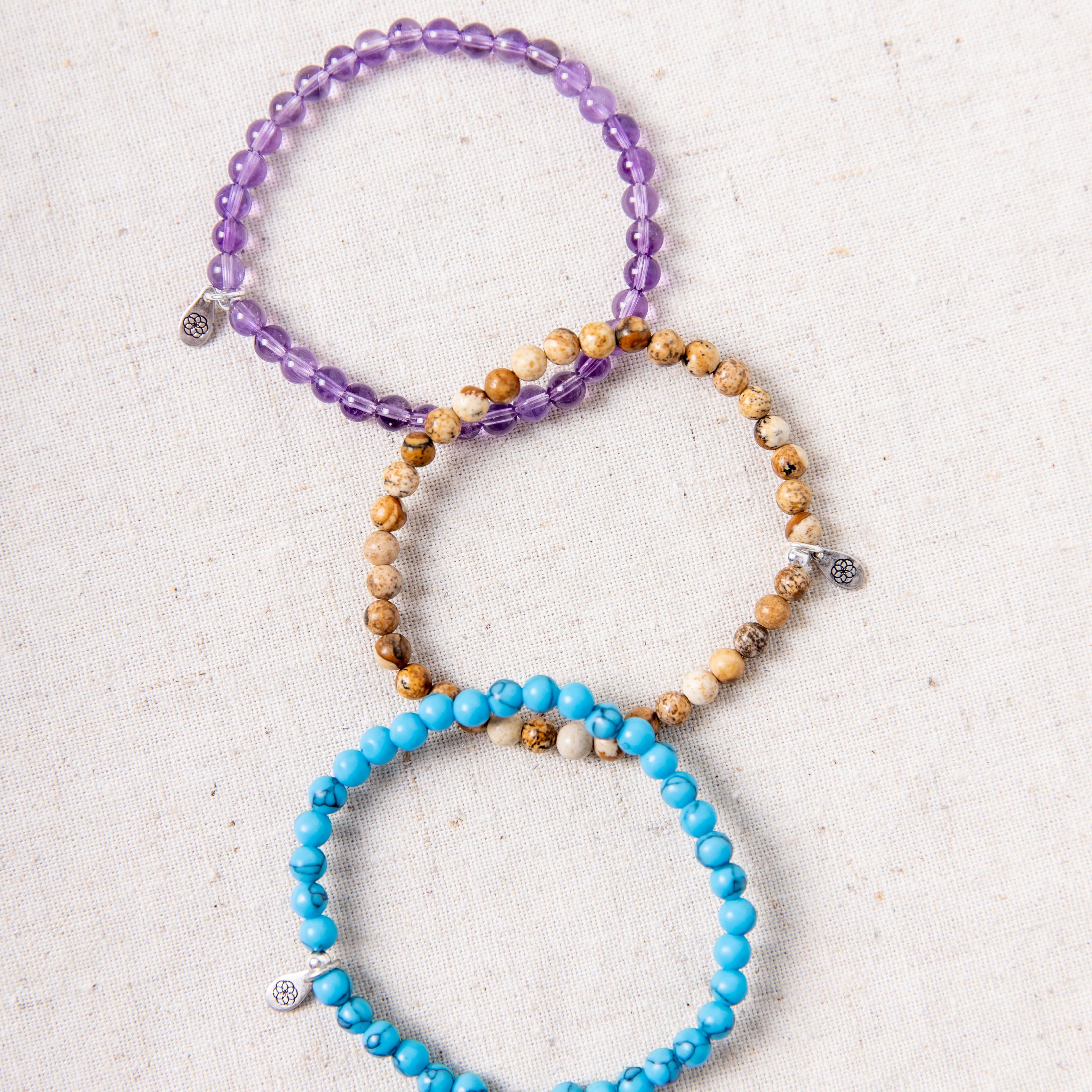 Invest in your intuition with this beloved Willpower and Guidance gemstone set. Three beautiful bracelets balance you out, soothing the mind and making space for your inner voice to ring. We all know that sometimes the heart and mind can fall out of sync and cause us to stumble through life blind, but the soft, supple components of Amethyst, Howlite Turquoise, and Picture Jasper are here to nudge you back on track.