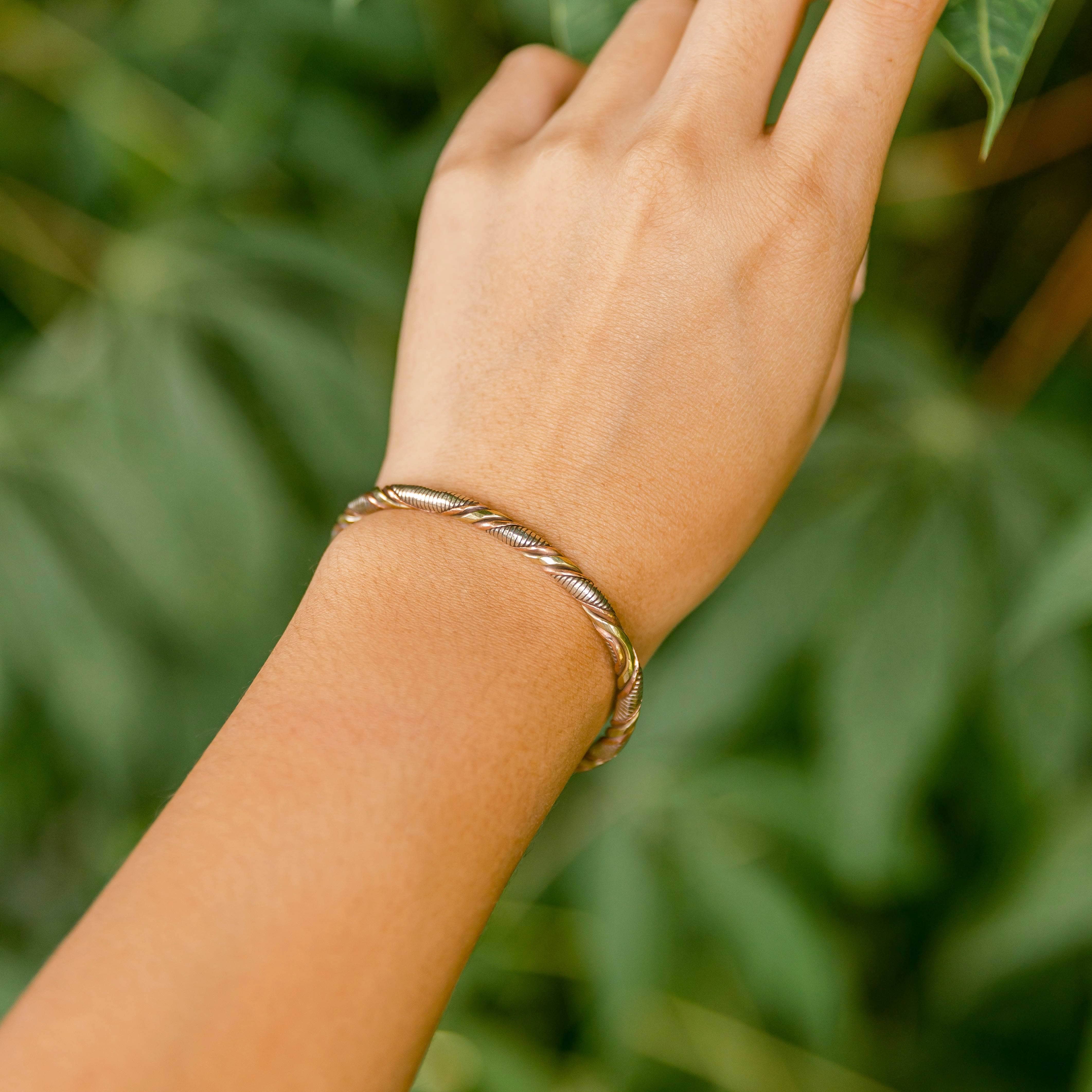 This Astrological Copper Bangle weaves the branches of copper, nickel, and beautiful brass to bring harmony to the human body, grace to the spirit, and clarity to the mind. While pure copper sings with physical benefits, its wonders run even deeper especially when it comes to the beliefs of a Vedic astrologer. In Hindu Astrology copper worn in the Kada way around the wrist can catch and deflect negative energy and will fill you with the power of the sun.