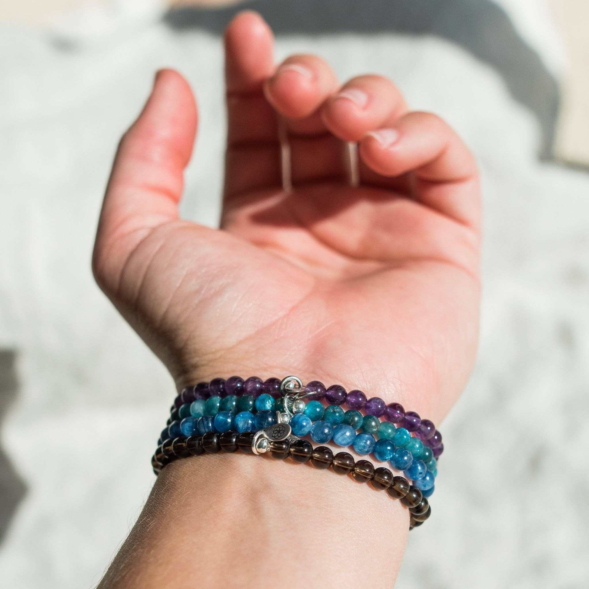 Lift your face to the sun and let go of the burdens in your hand with the gentle healing vibes from this rich compassion gemstone bracelet set. The Forgiveness and Compassion Pack weaves together the healing shades of soft Kyanite, Apatite, Amethyst and Smoky Quartz so you can set your heart space free.