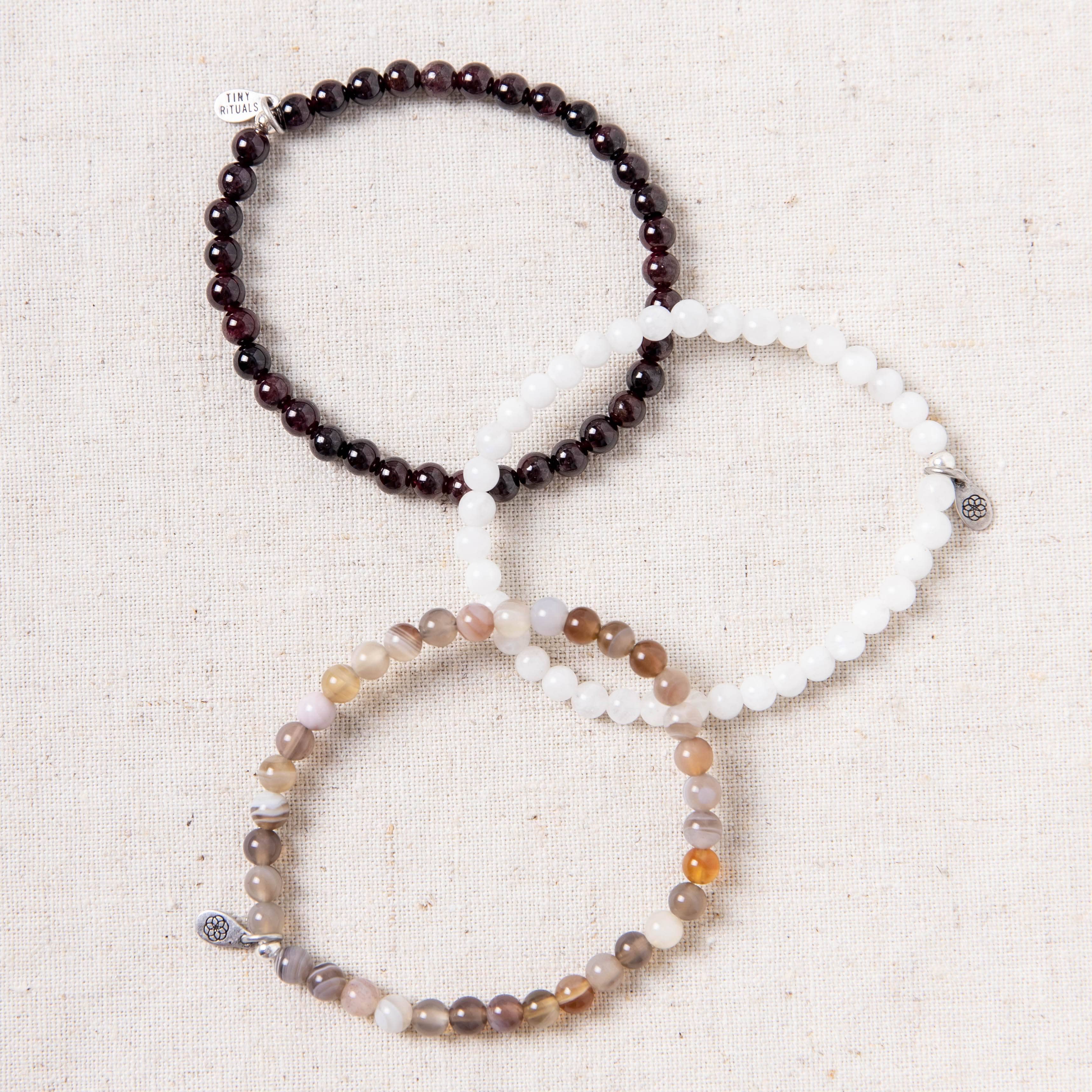 Get ready to be your own guiding light with the Positivity and Intuition Pack. Calling on the bouncing beams of Moonstone, the fiery hued passion of glowing Garnet, and the earthly spirit of Botswana Agate, these three chosen precious stone bracelets will open you up to your own rhythm and flow.
