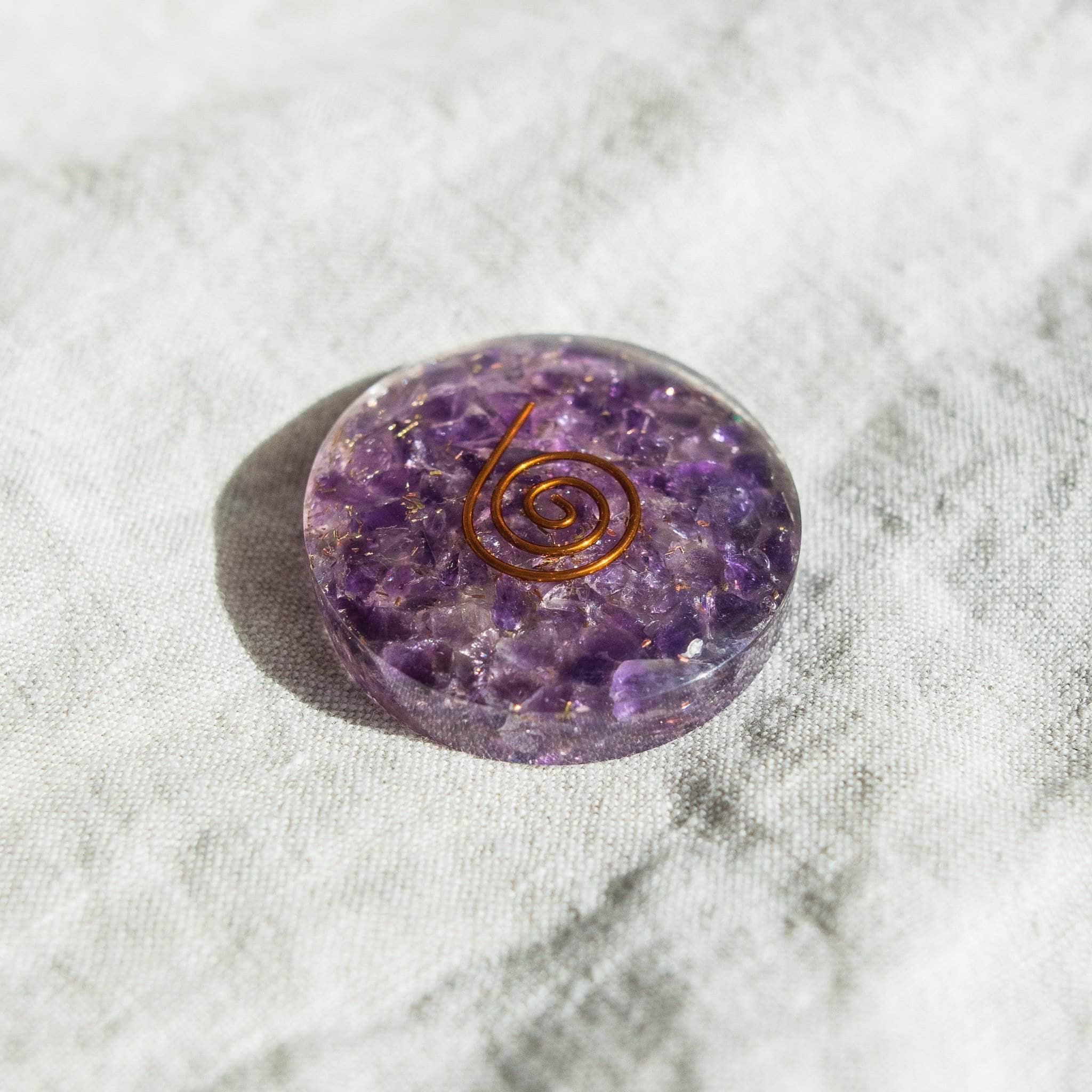 The Amethyst Orgone Disc is for those who want to soak their soul in serene energy. Bring patience and peace to your world with this deeply spiritual purple gem that connects beautifully with the heavenly realms.