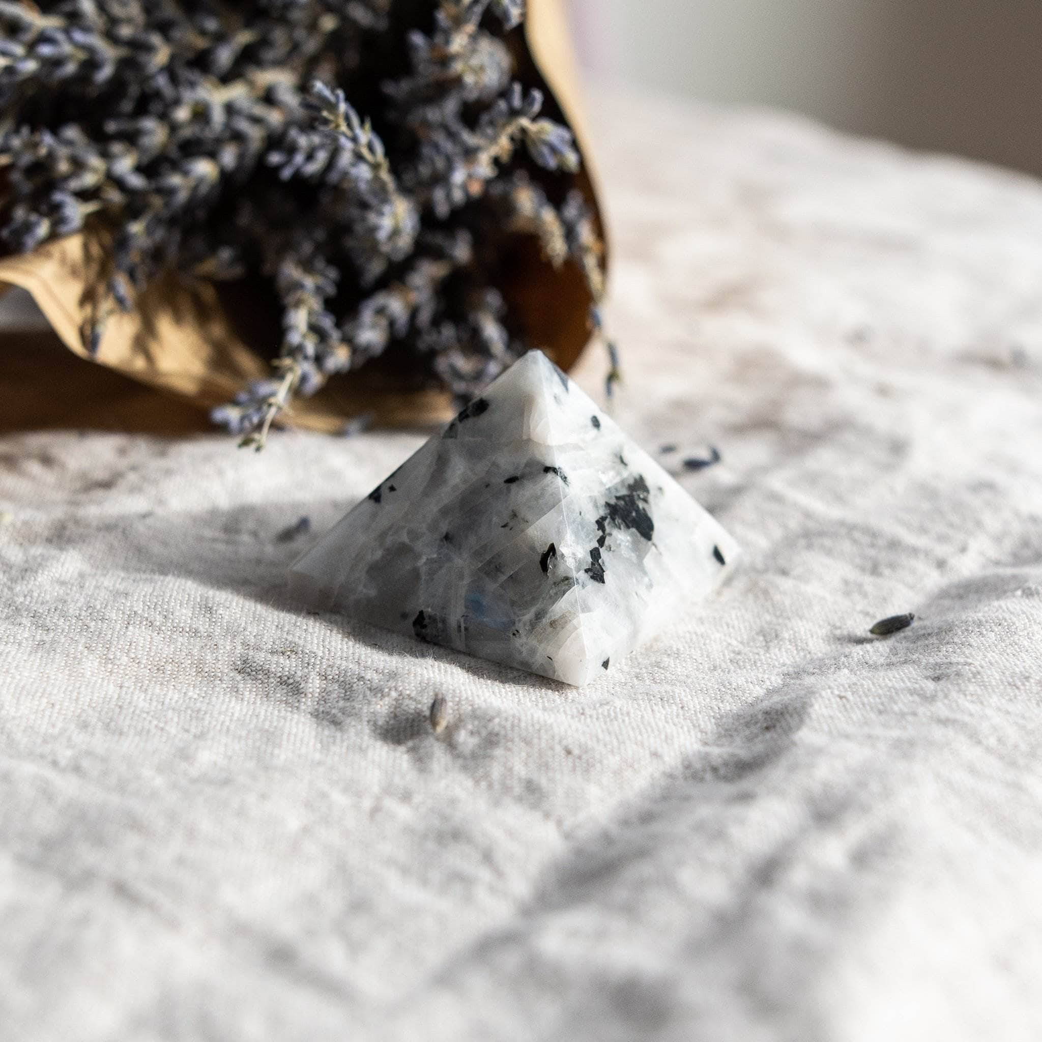 The sacred geometry of the pyramid shape is the perfect form for the Moonstone to take. With a grounded base for stability, four sides for embracing life from different angles, and an apex that points to the sky above – it is the perfect representation of this gem that invites you to journey from earth to the depths of the lunar sky. With the Rainbow Moonstone, the night is never dark but filled with hope, light, creative swirls, and a streak of magic.