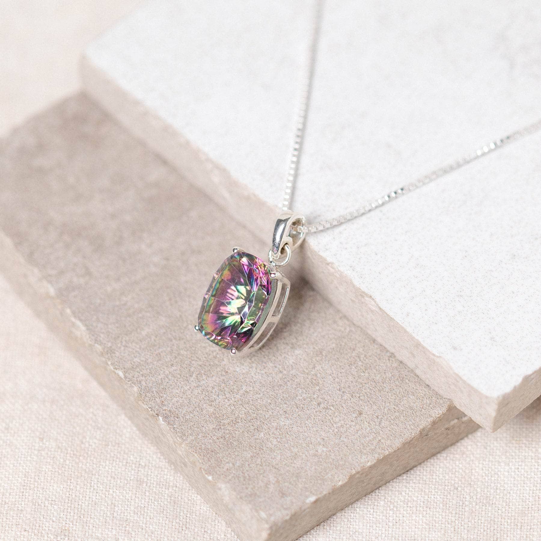Shimmering with rainbow flashes, Mystic Topaz is a stone of joy, abundance, and spiritual alignment. Cut in a timeless emerald shape, this pendant reflects light with brilliance—making it both a radiant statement accessory and a meaningful talisman of positivity and protection.