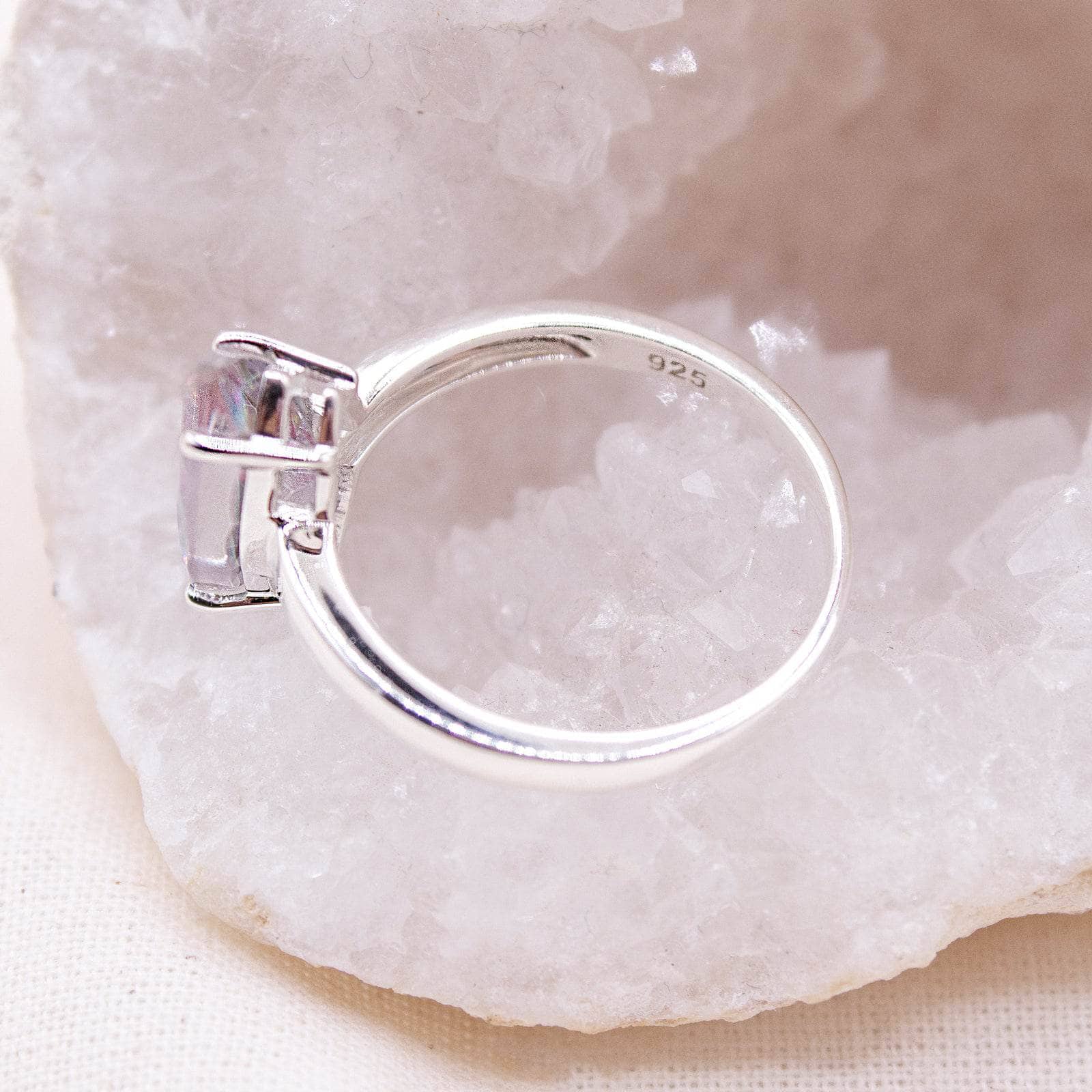 Alive with shimmering rainbow hues, Mystic Topaz is cherished as a stone of joy, abundance, and spiritual harmony. Set in a dazzling diamond cut, this rare ring captures light from every angle—making it both a radiant statement piece and a meaningful talisman of positivity and protection.