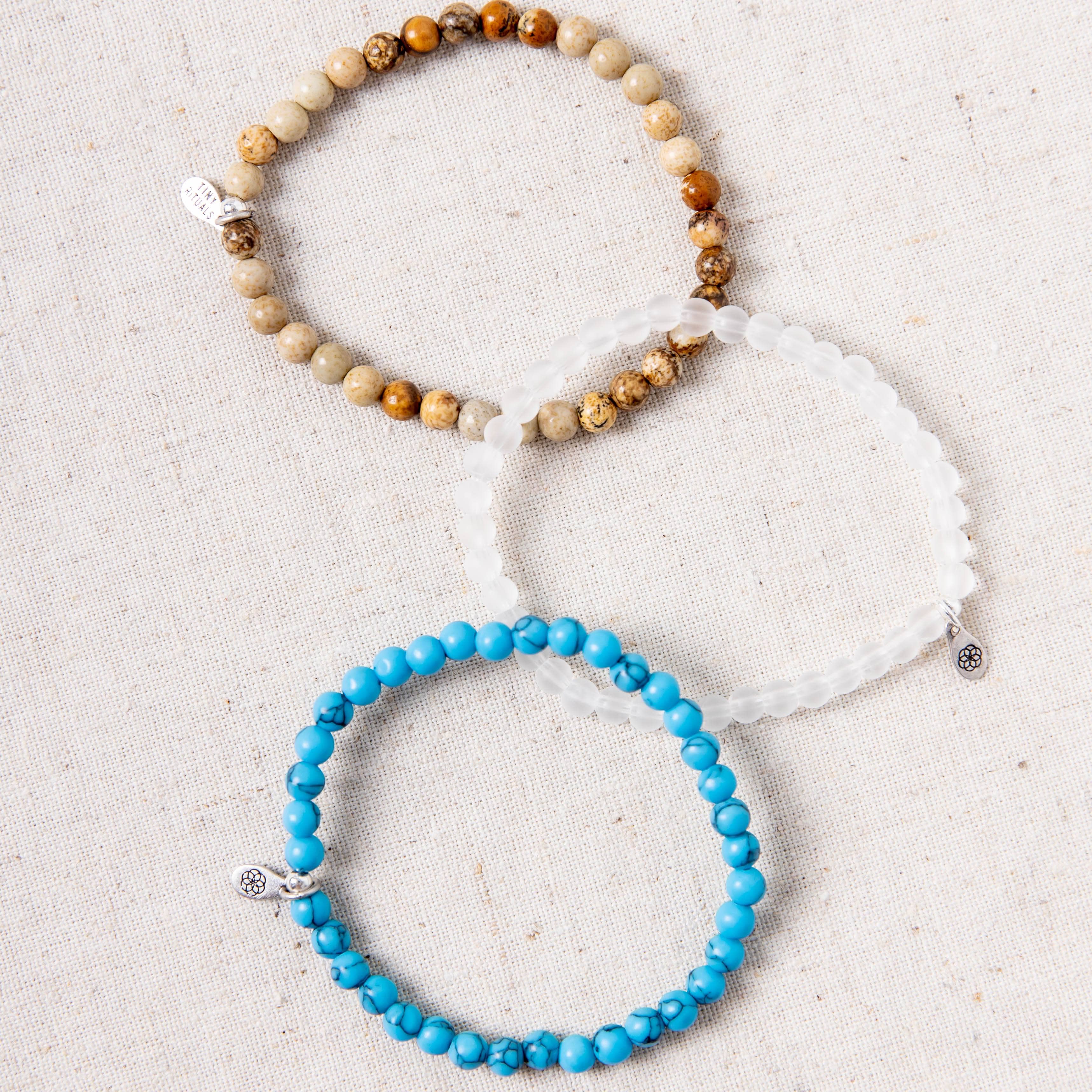 Open your eyes, your heart, and your mind and connect with the most profound vibrations of the cosmos as you slip on the fabulous three that make up the Awareness and Connection Pack. From a calming flow of thought to clearer views on life, Snow Quartz, Picture Jasper, and Turquoise Howlite come together to bring awareness brimming to the surface.